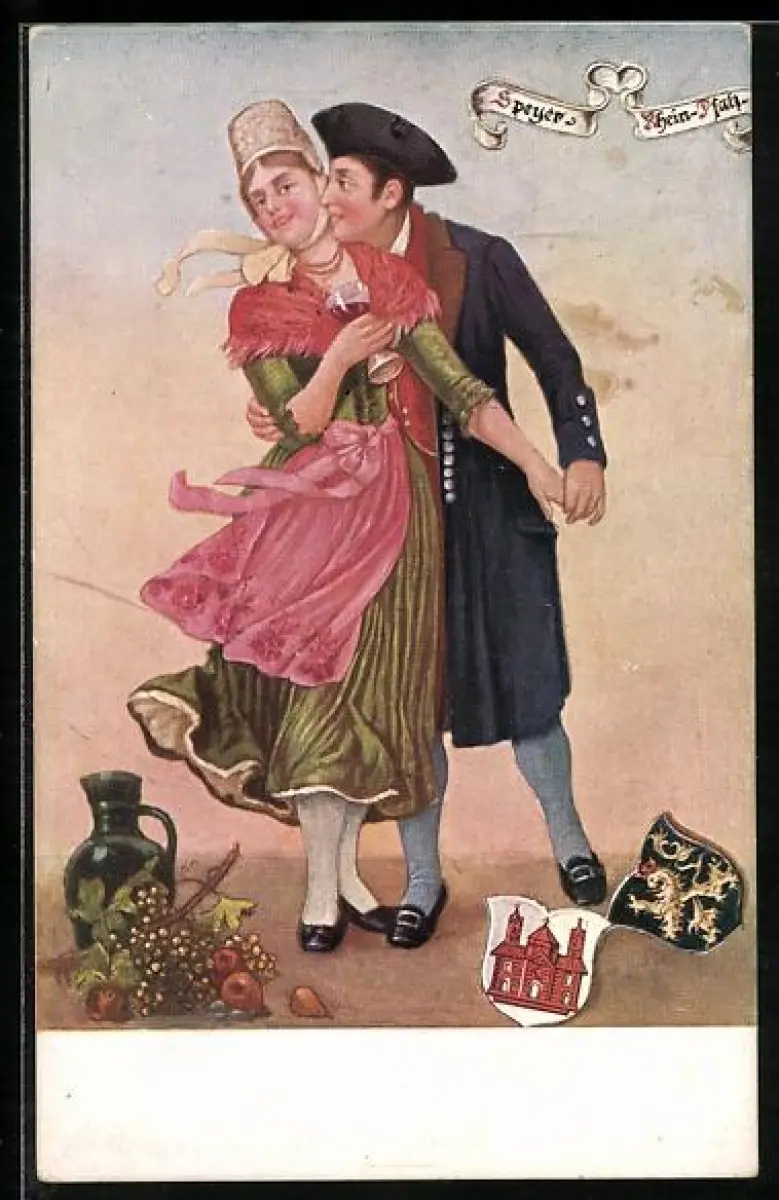 AK Speyer, Rhein-Pfalz, Paar in bayerische Tracht, Wein, Wappen