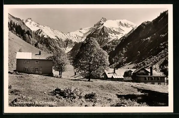 AK Spielmannsau, Ortspartie mit Gebirgspanorama