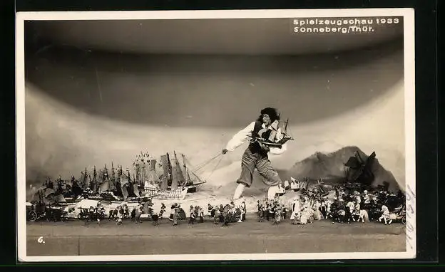 AK Spielzeugschau in Sonneberg 1933, Riese zieht Segelschiffe an Seilen