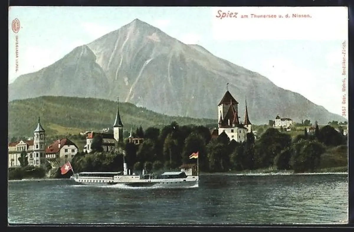 AK Spiez, Blick zum Ort am Thunersee und zum Niesen, Dampfer