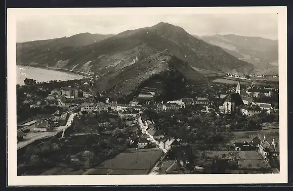 AK Spitz /Donau, Totalansicht mit Bergen und Donaublick aus der Vogelschau