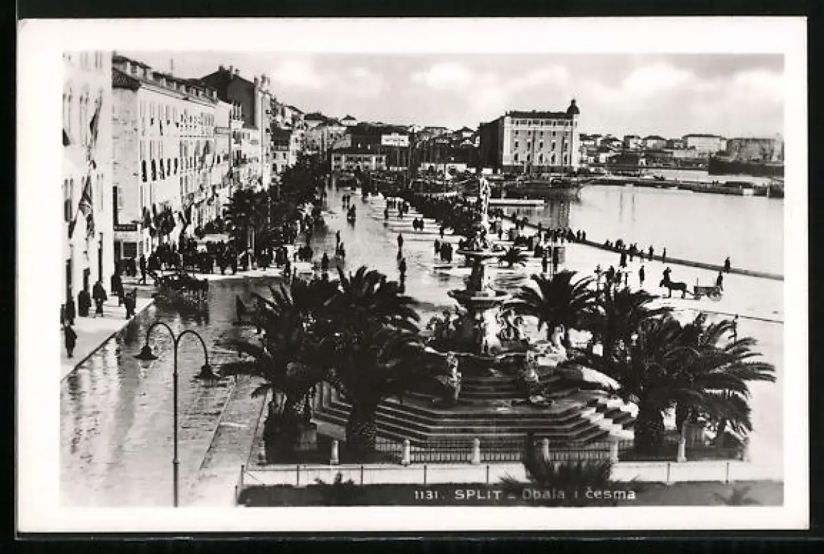 AK Split, Obala i cesma, Hafenpartie mit Brunnen an einem regnerischen Tag