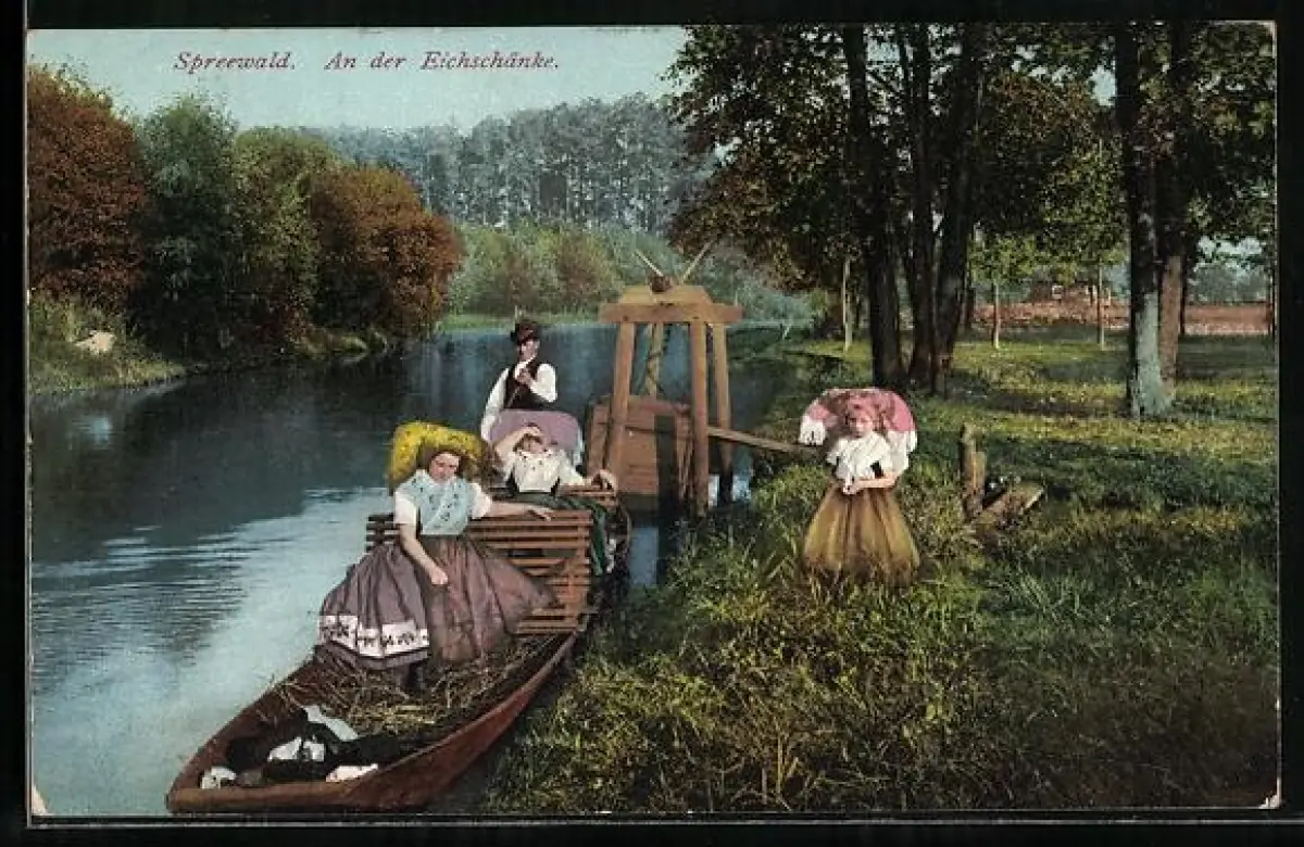 AK Spreewald, An der Eichschänke, Familie in Tracht