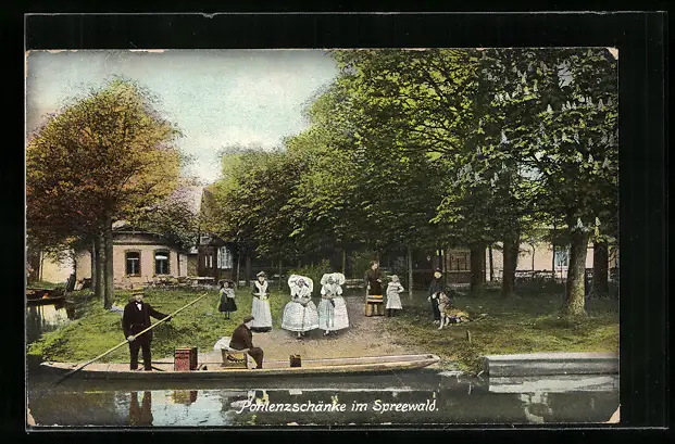 AK Spreewald, Pohlenzschänke u. Boot vor Frauen in Trachten