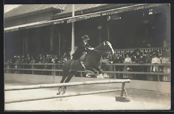 AK Springreiter beim Überspringen einer Hürde, Tribüne mit Publikum