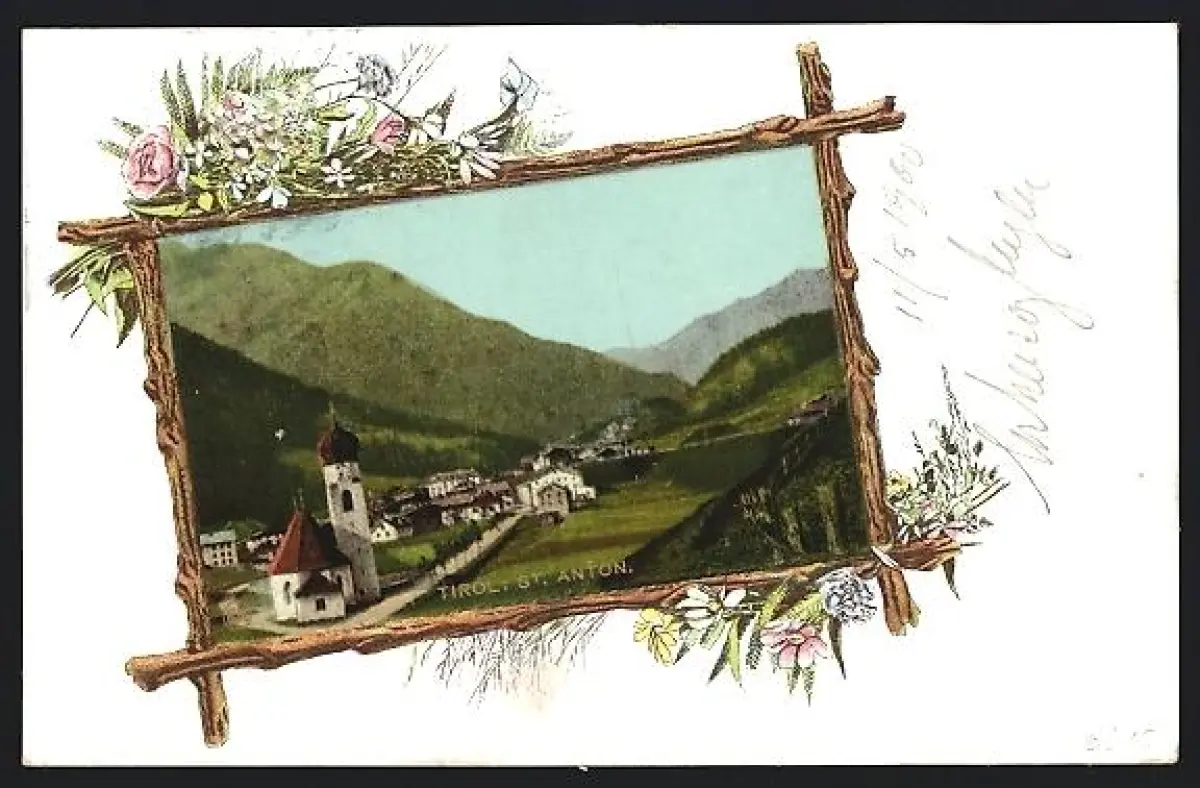 AK St. Anton /Tirol, Teilansicht des Ortes mit umgebendem Gebirge, Bilderrahmen mit Blumen