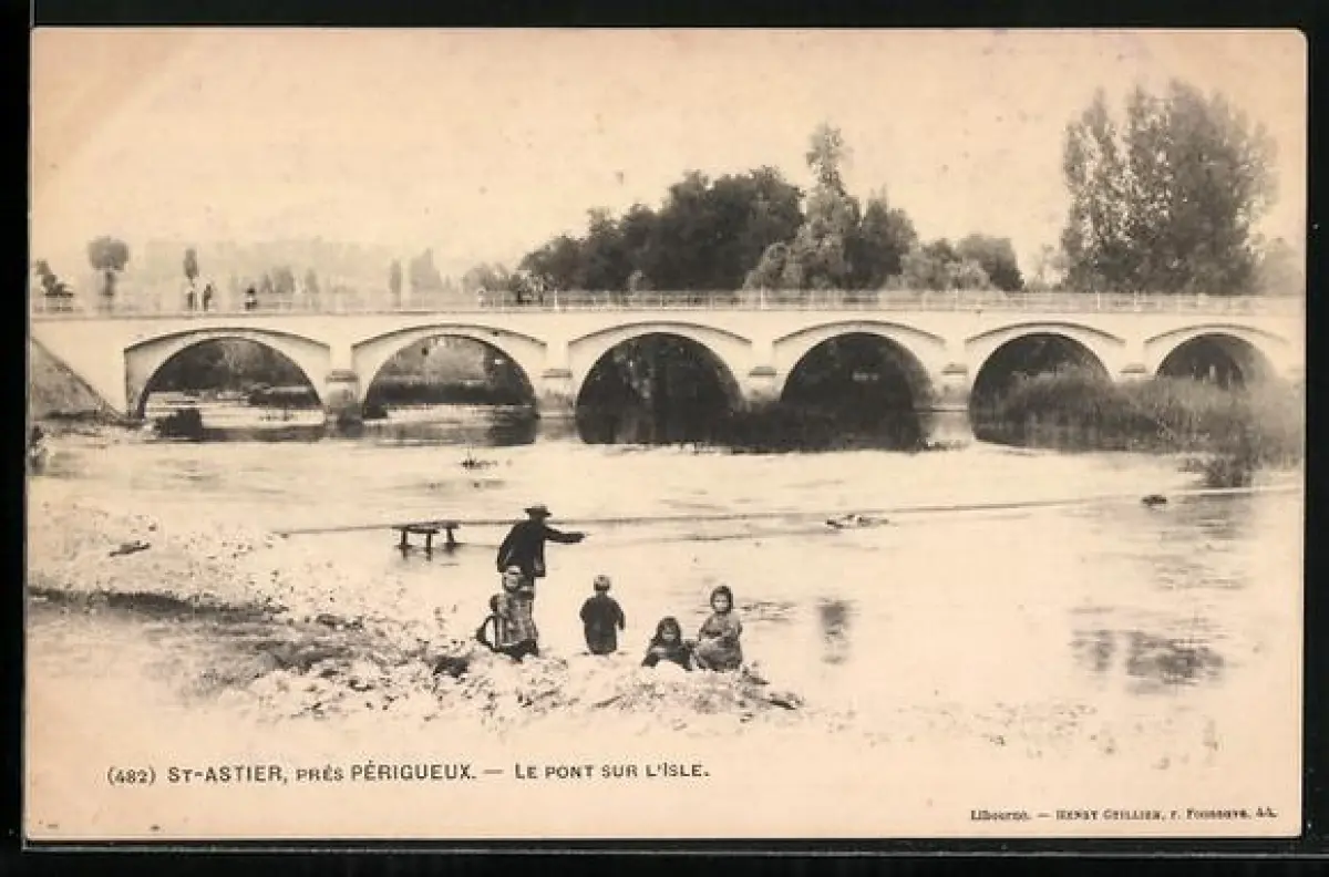 AK St-Astier /Périgueux, Le pont sur l`Isle avec des gens au bord de l`eau