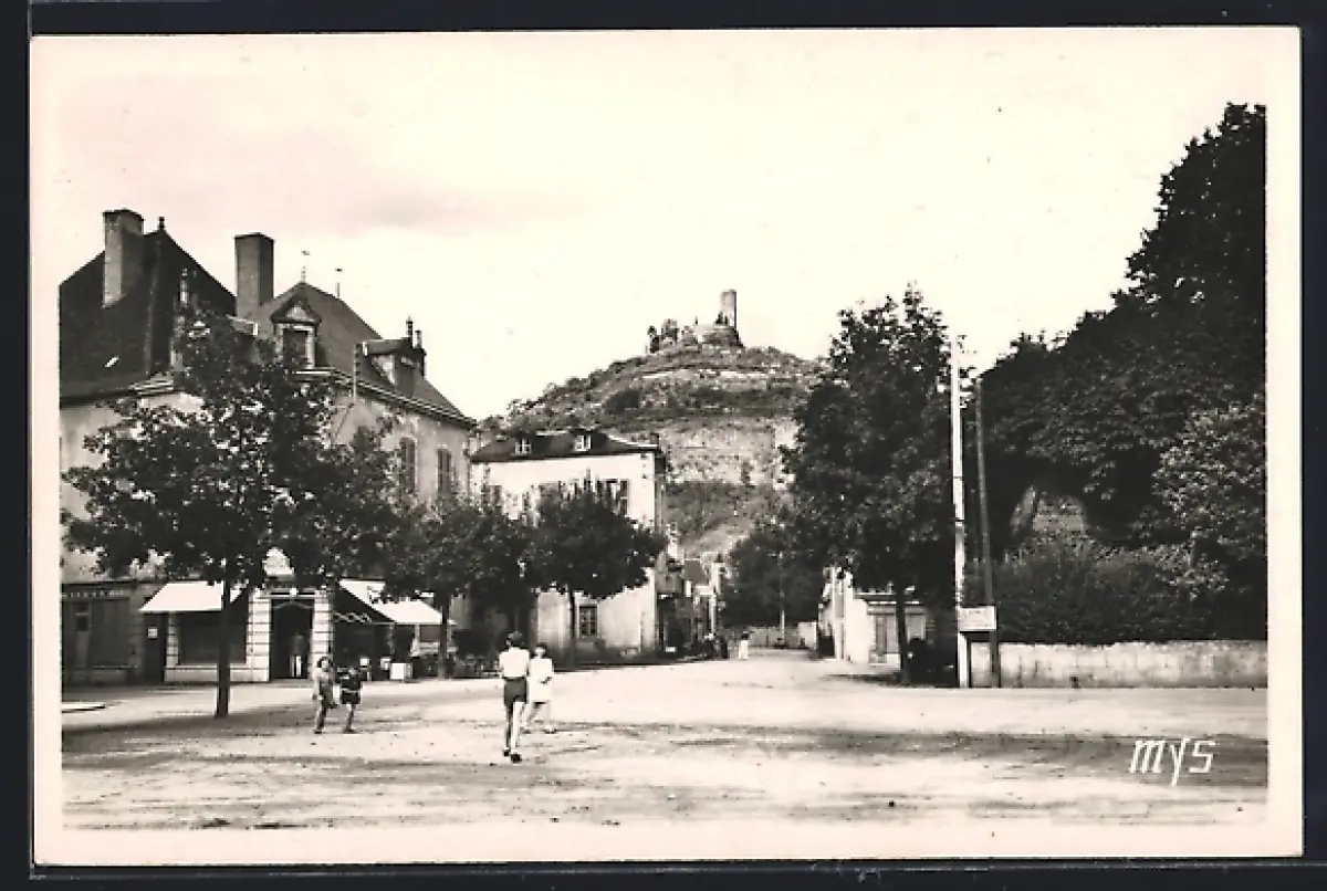AK St Céré /Lot, Boulevard Carnot avec vue sur la colline et ruines en arrière-plan