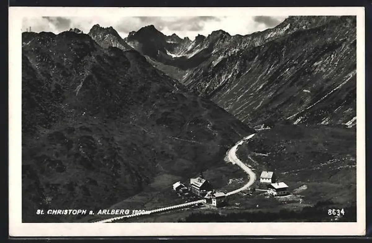 AK St. Christoph a. Arlberg, Ortsansicht vom Berghang aus