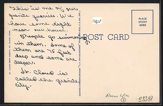 Personenbezogene Daten auf der Rückseite der Karte wurden durch blauen Textmarker unkenntlich gemacht. Die blauen Stellen sind auf die Vorderseite durchgeweicht und wirken sich negativ auf das Postkartenfoto aus