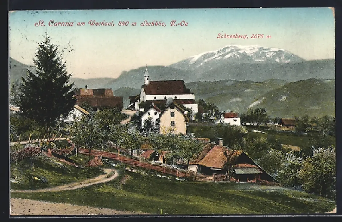 AK St. Corona am Wechsel, Strassenpartie mit Gehöft vor Bergpanorama mit dem Schneeberg