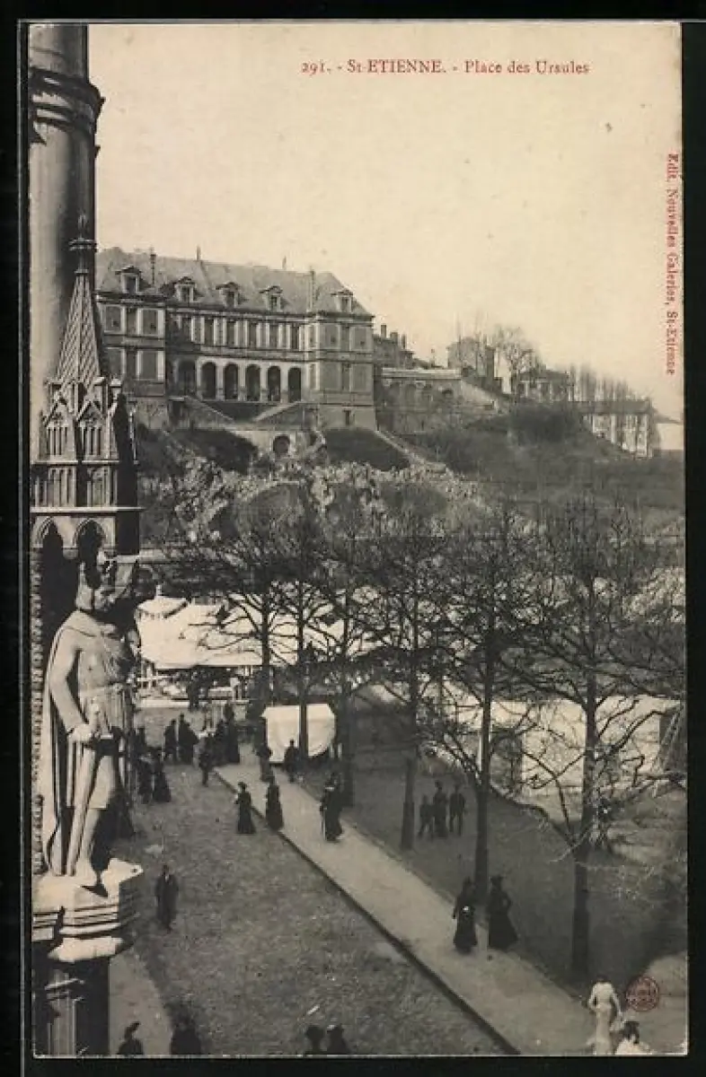 AK St.-Etienne, Place des Ursules avec vue sur le bâtiment et les passants