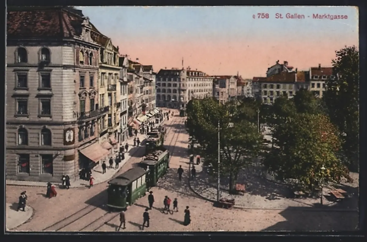 AK St. Gallen, Blick in die Marktgasse, Strassenbahn