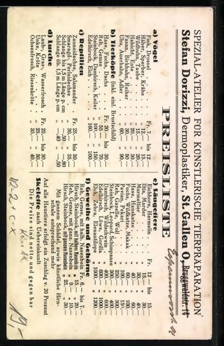 AK St. Gallen, Spezial-Atelier für künstlerische Tierpräparation Stefan Dorizzi, Bruggwaldstrasse 14, Jagd