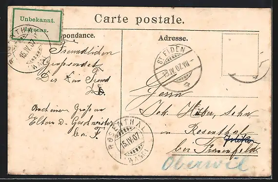 alte Ansichtskarte, gelaufen 1907, Briefmarke entfernt, rückseitig Klebe- und Papierreste, Abriebspur re. oben, guter Zustand