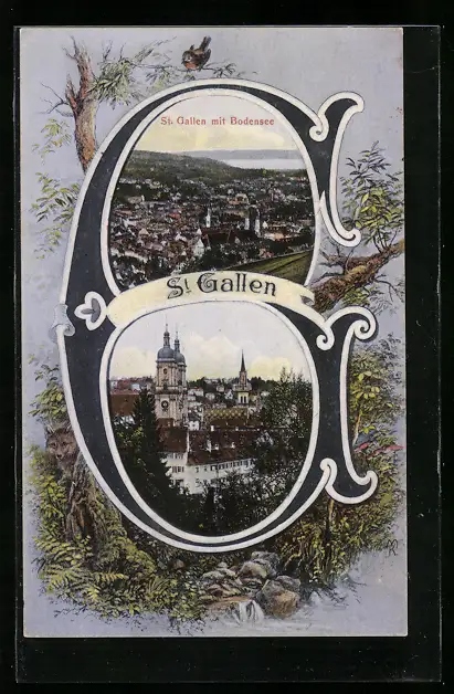 AK St. Gallen, Teilansicht mit Kirche, Panorama mit Bodensee, Buchstabe G
