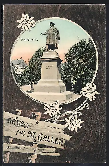 AK St. Gallen, Vadiandenkmal, Passepartout mit Edelweiss
