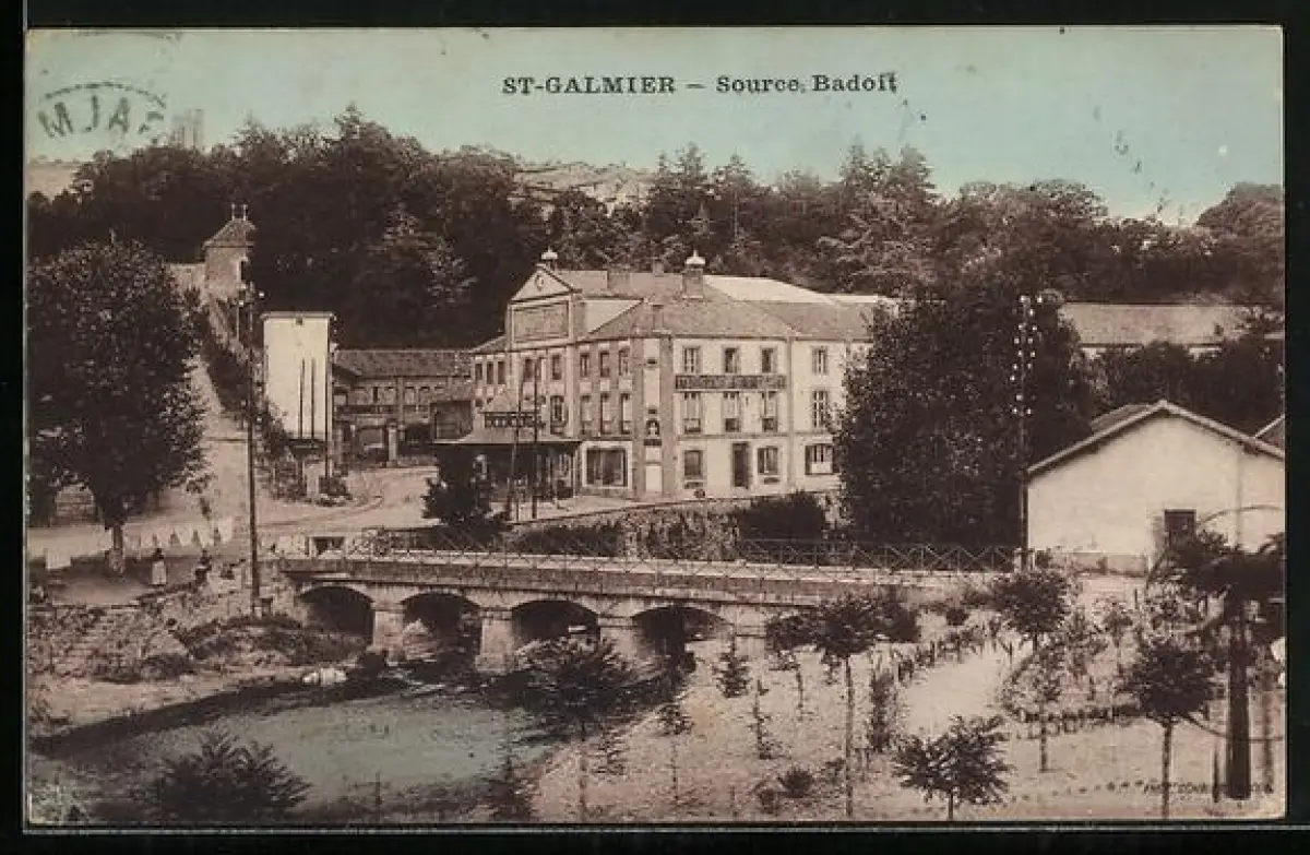 AK St-Galmier, Source Badoit et pont sur la rivière