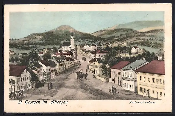 AK St. Georgen im Attergau, Strassenpartie aus der Vogelschau, Blick zur Kirche
