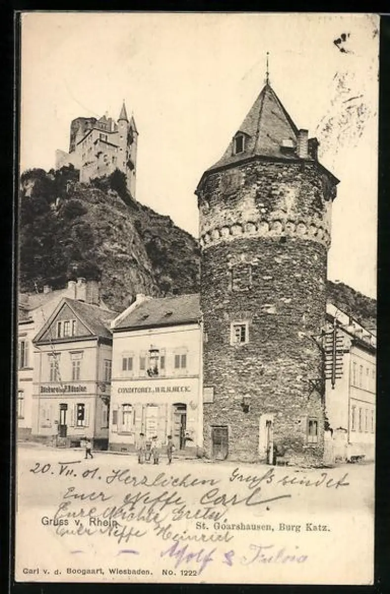 AK St. Goarshausen, Burg Katz mit Café Wilh. Heck