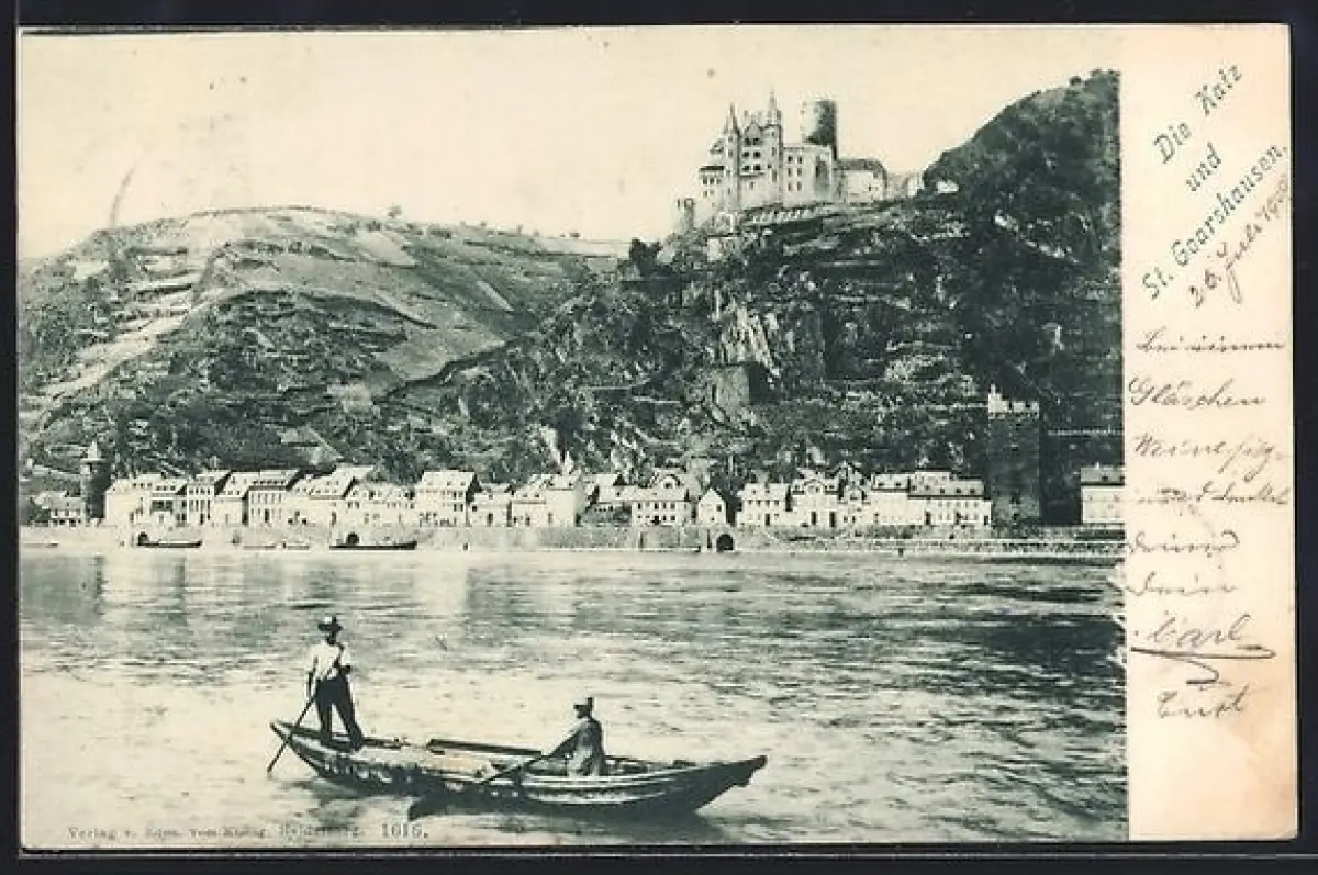AK St. Goarshausen, Ortsansicht mit Burg Katz, mit Bootspartie