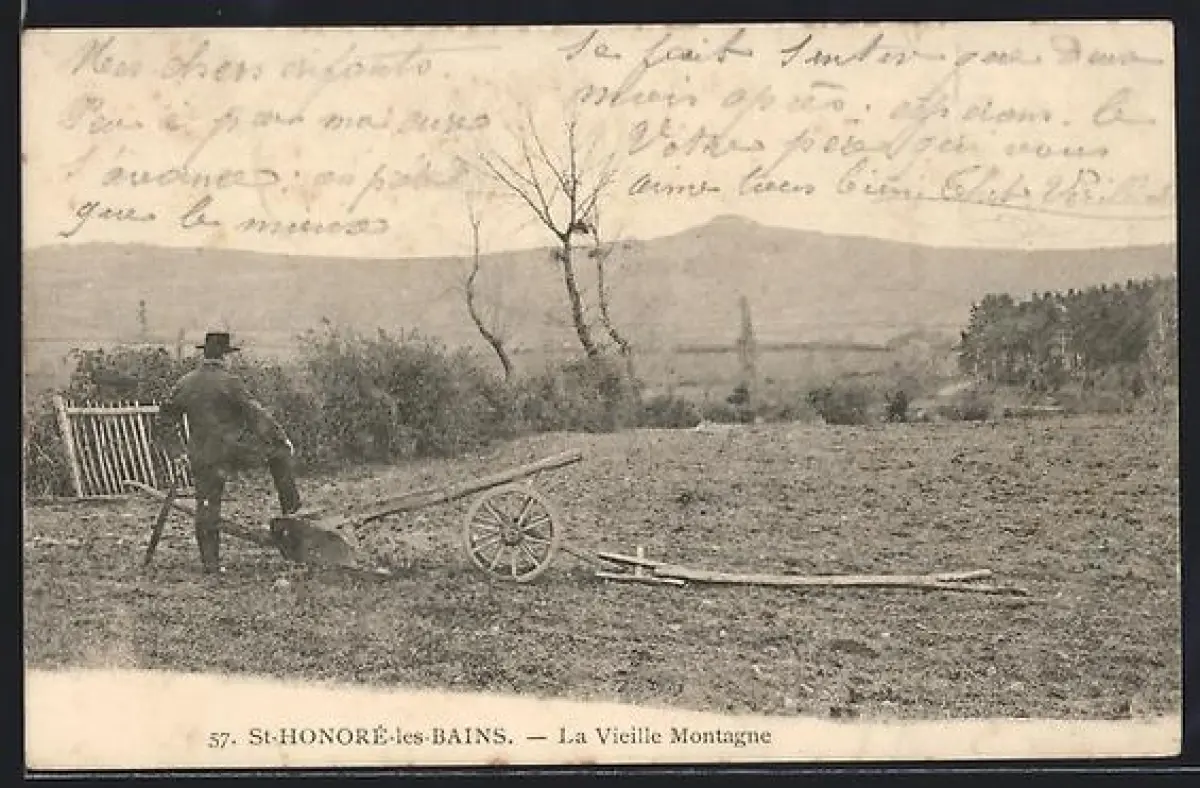 AK St-Honoré-les-Bains, La Vieille Montagne avec un homme et une charrette dans un champ