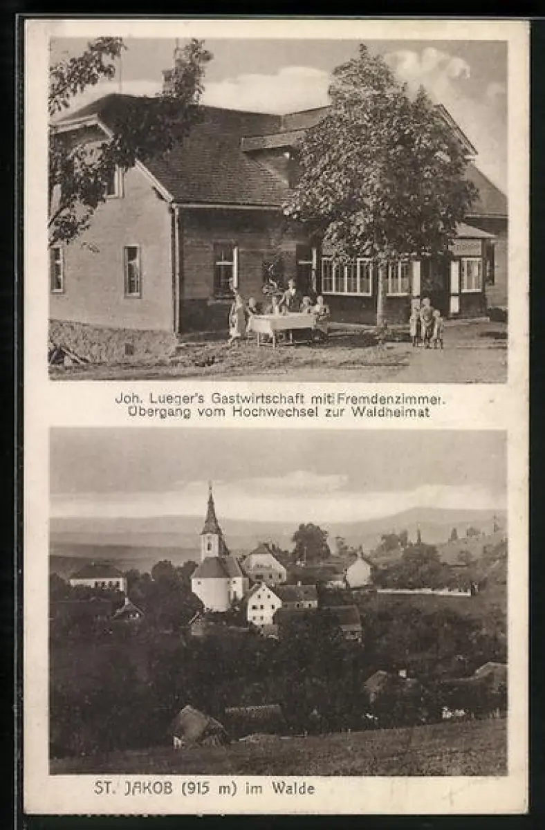 AK St. Jakob im Walde, Pension-Gasthaus Joh. Lueger, Ortspartie mit Kirche