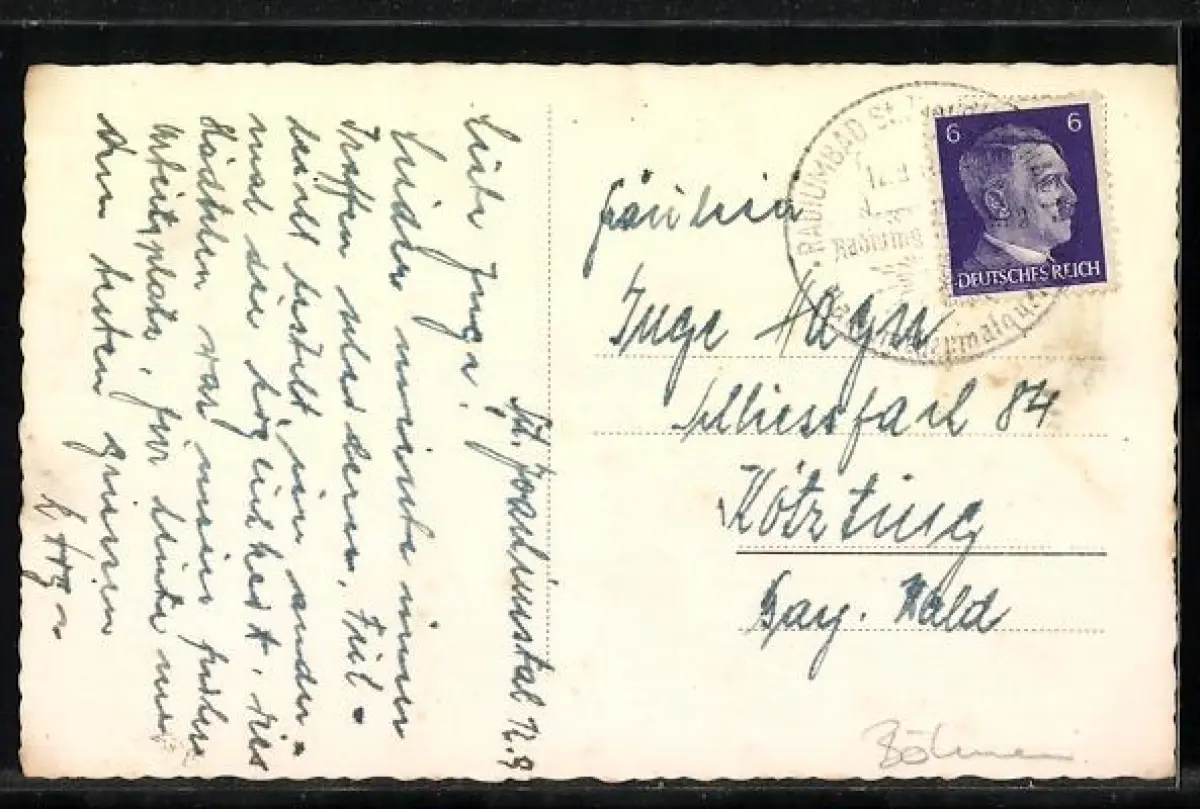 Personenbezogene Daten auf der Rückseite der Karte wurden durch blauen Textmarker unkenntlich gemacht. Die blauen Stellen sind auf die Vorderseite durchgeweicht und wirken sich negativ auf das Postkartenfoto aus