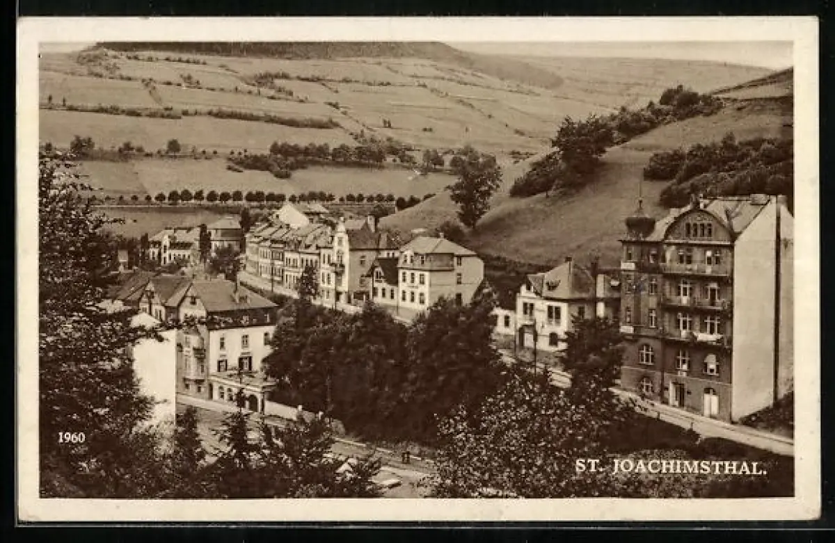 AK St. Joachimsthal, Teilansicht mit Strasse aus der Vogelschau