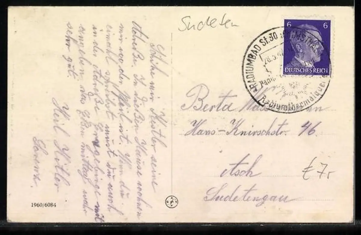 Personenbezogene Daten auf der Rückseite der Karte wurden durch blauen Textmarker unkenntlich gemacht. Die blauen Stellen sind auf die Vorderseite durchgeweicht und wirken sich negativ auf das Postkartenfoto aus