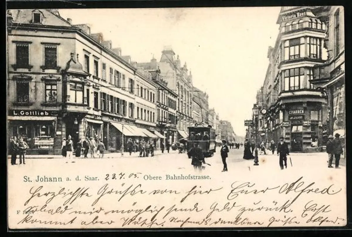 AK St. Johann / Saarbrücken, Obere Bahnhofstrasse mit Strassenbahn