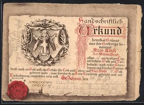 AK St. Johann, Urkunde über den Besuch in der Herberge Altes Kindl, Münchner Kindl