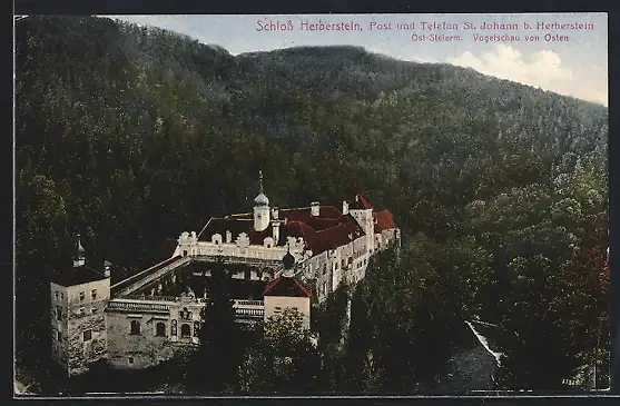 AK St. Johann b. Herberstein, Schloss Herberstein aus der Vogelschau von Osten