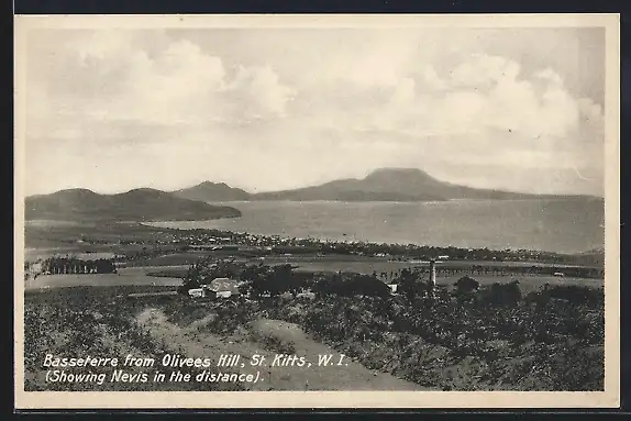 AK St. Kitts, W. I., Basseterre from Olivees Hill, showing Nevis in the distance