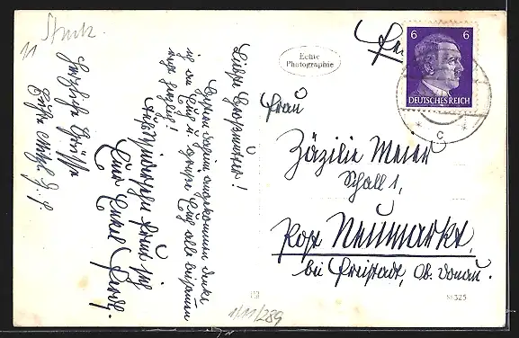 Personenbezogene Daten auf der Rückseite der Karte wurden durch blauen Textmarker unkenntlich gemacht. Die blauen Stellen sind auf die Vorderseite durchgeweicht und wirken sich negativ auf das Postkartenfoto aus