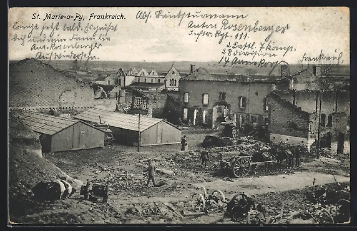 AK St. Marie-à-Py, la ville entièrement détruite par les bombardements, soldats