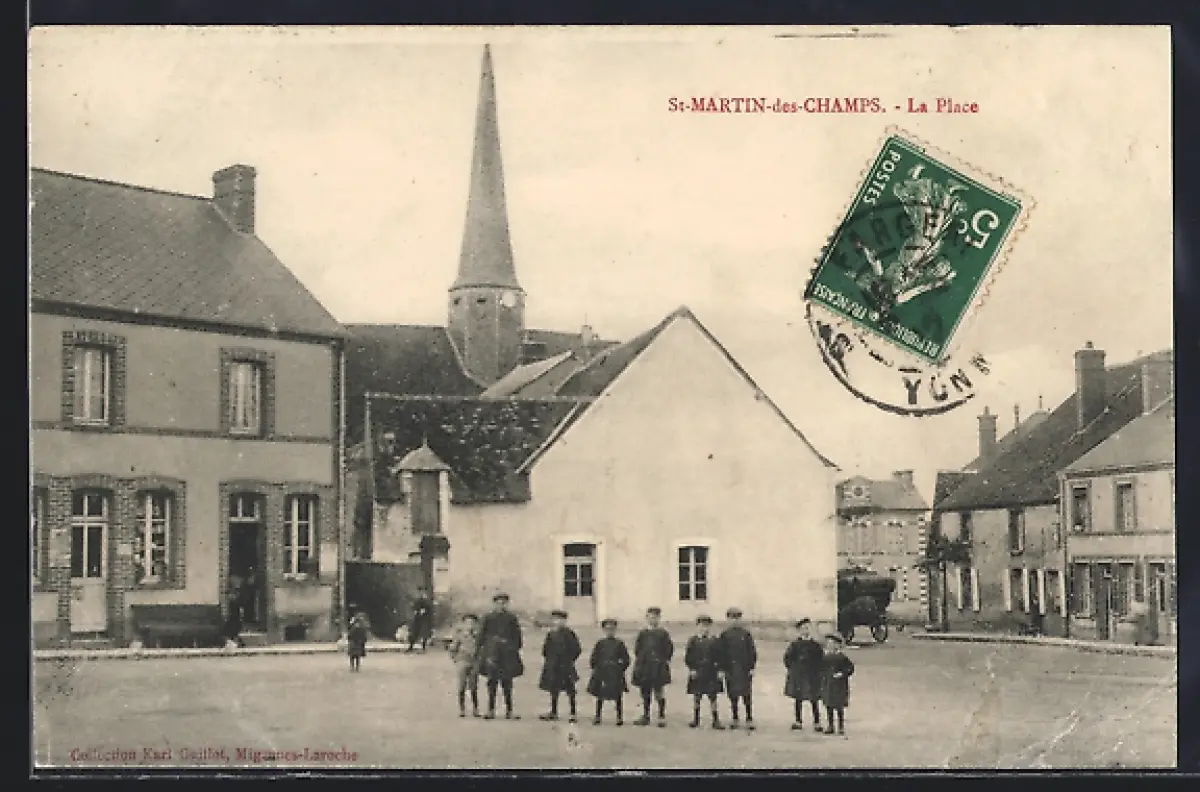 AK St-Martin-des-Champs, La Place avec enfants posant devant l`église et les bâtiments adjacents