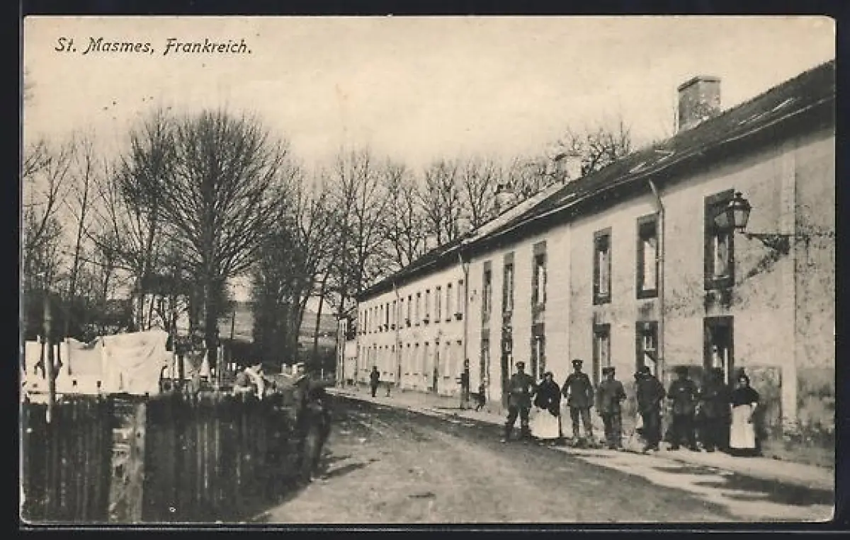 AK St. Masmes, Vue de la rue avec groupe de soldats devant des maisons et arbres en hiver