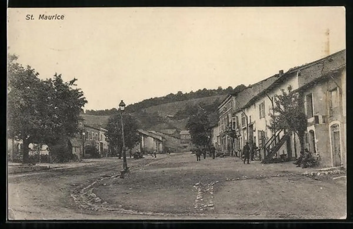 AK St. Maurice, Rue principale avec maisons et colline en arrière-plan