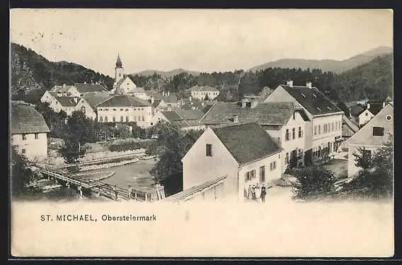 AK St. Michael /Obersteiermark, Blick über die Dächer zur Kirche