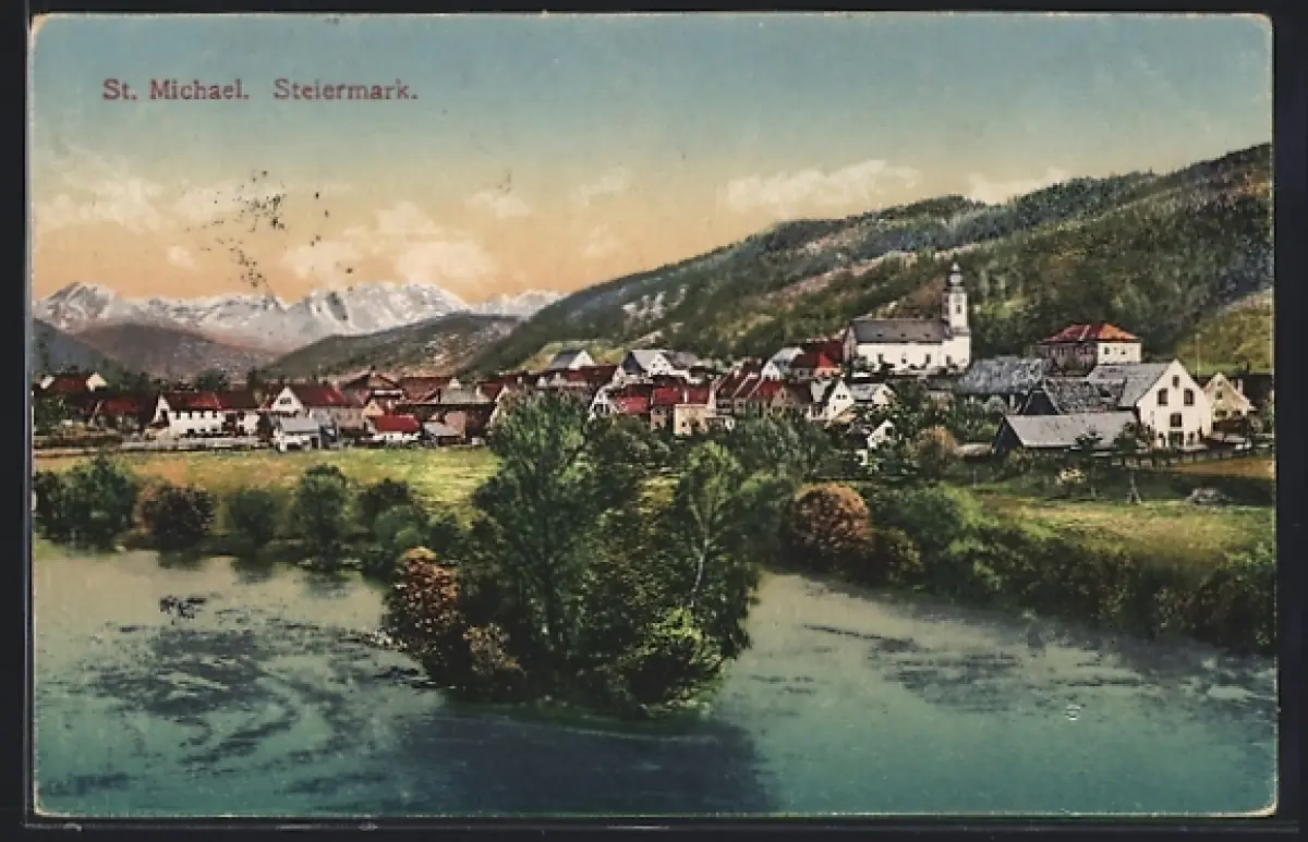 AK St. Michael /Steiermark, Ortsansicht mit Uferpartie