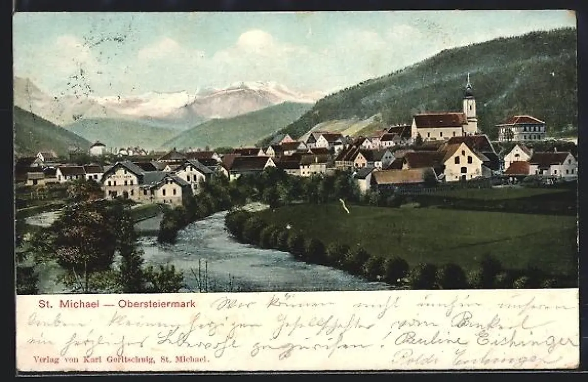 AK St. Michael /Stmk., Panorama mit Fluss, Kirche
