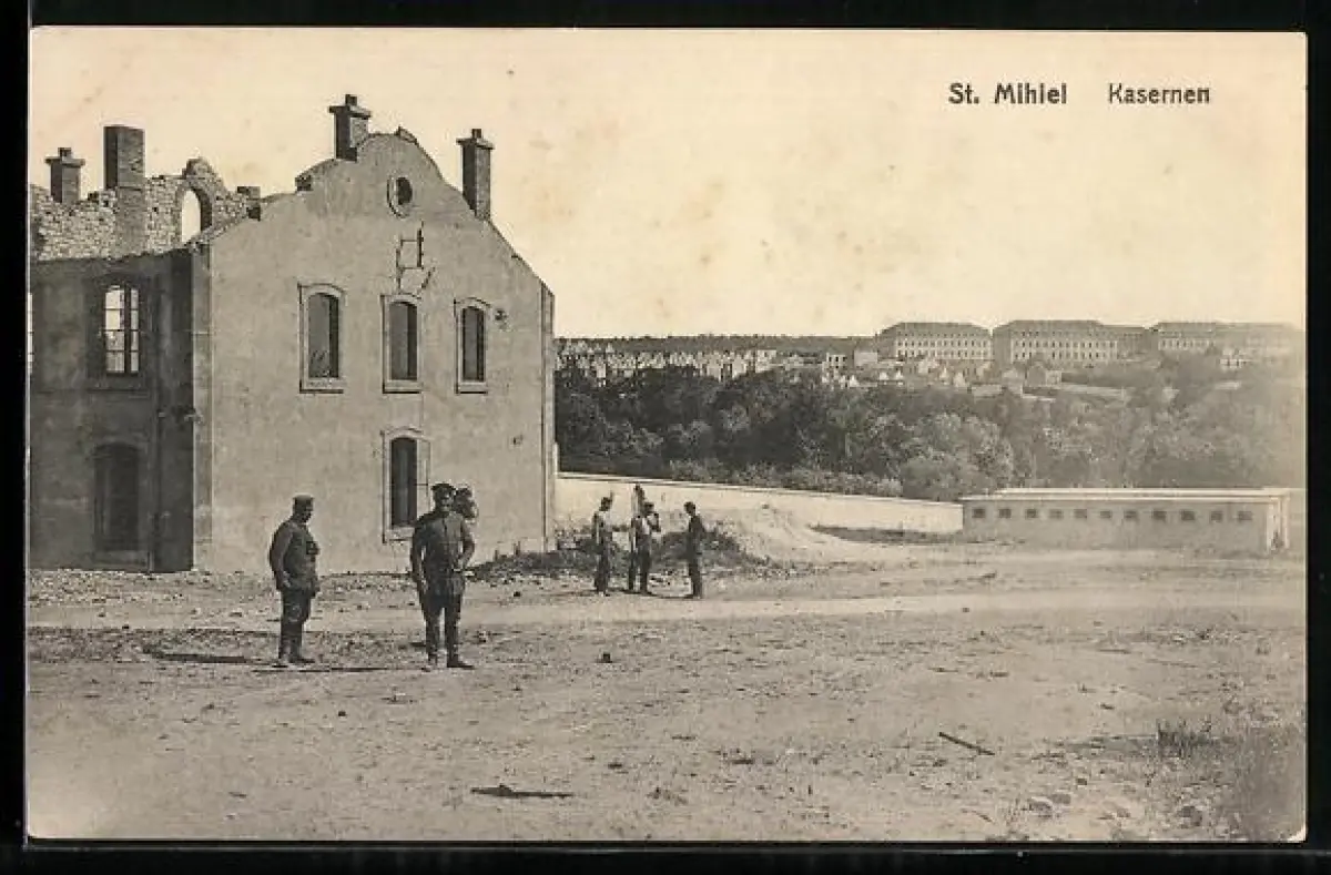 AK St. Mihiel, Kasernen et soldats devant les bâtiments militaires, ruine