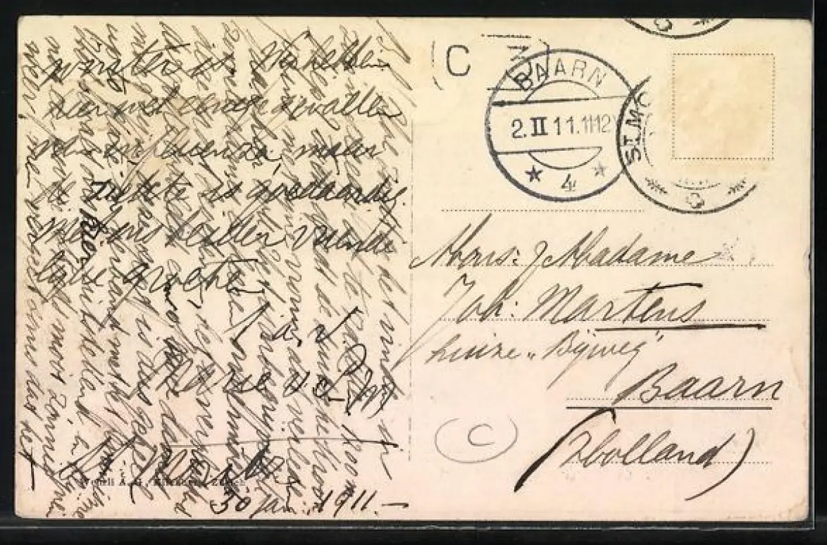 gelaufen 1911, Ecken bestoßen, Briefmarke entfernt, guter Zustand