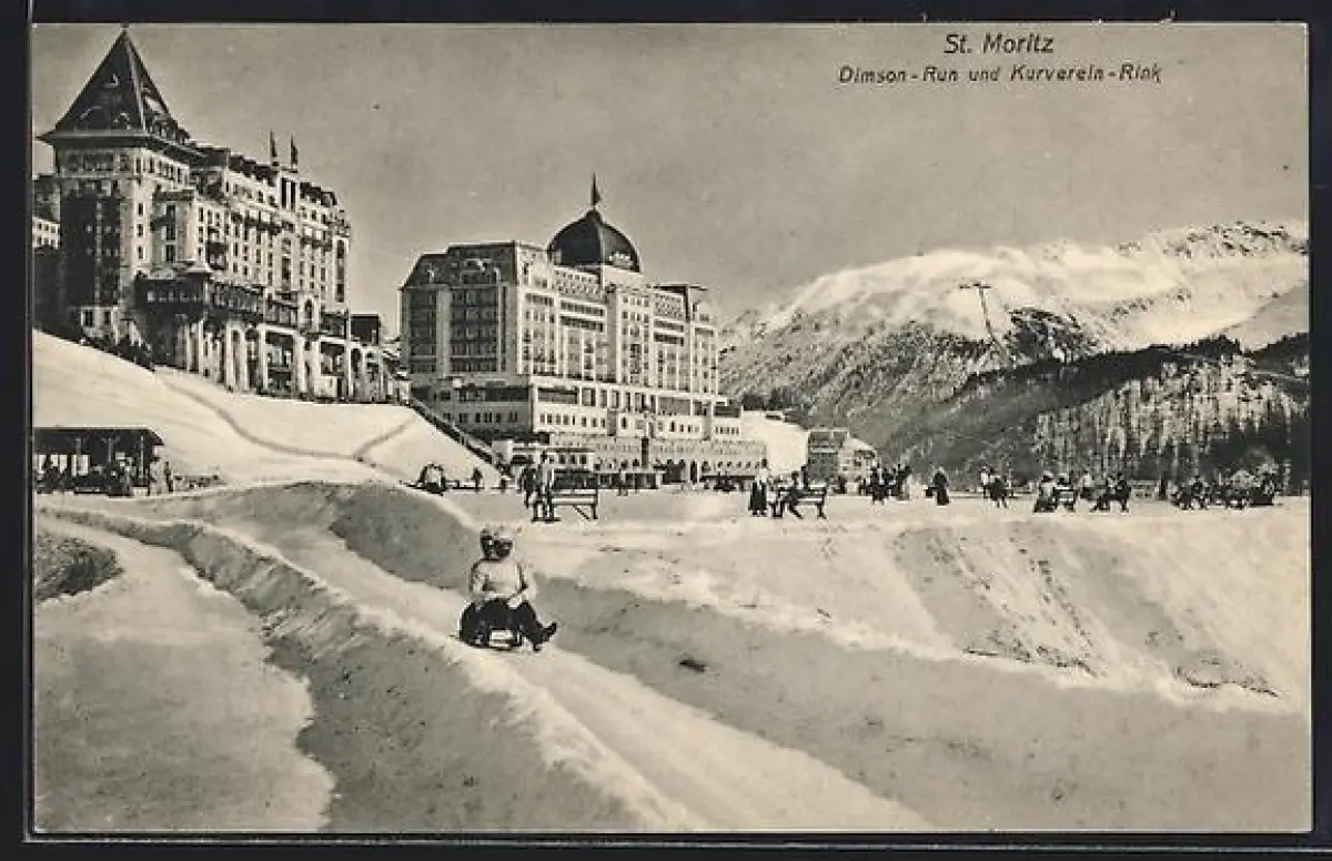 AK St. Moritz, Dimson-Run und Kurverein-Rink im Winter mit Schlittenfahrer