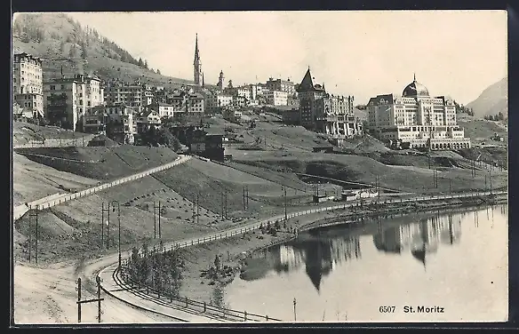 AK St. Moritz, Ortsansicht mit Uferstrasse vom Wasser aus
