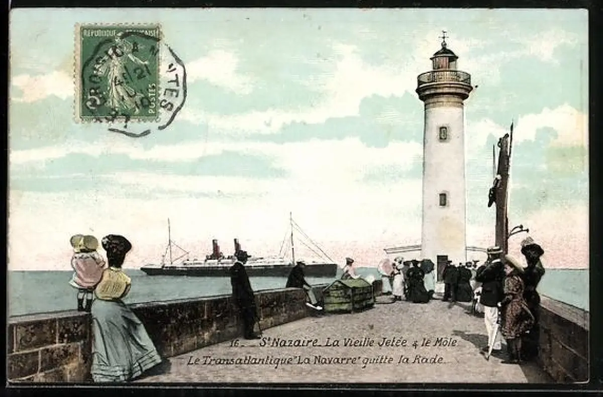 AK St-Nazaire, La Vieille Jetée & le Môle, Le Transatlantique La Navarre quitte la Rade, Leuchtturm