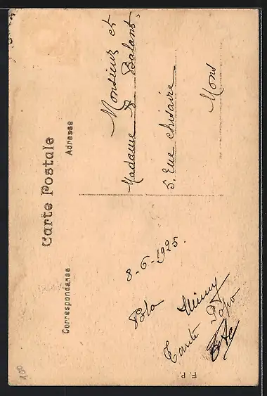 Personenbezogene Daten auf der Rückseite der Karte wurden durch blauen Textmarker unkenntlich gemacht. Die blauen Stellen sind auf die Vorderseite durchgeweicht und wirken sich negativ auf das Postkartenfoto aus