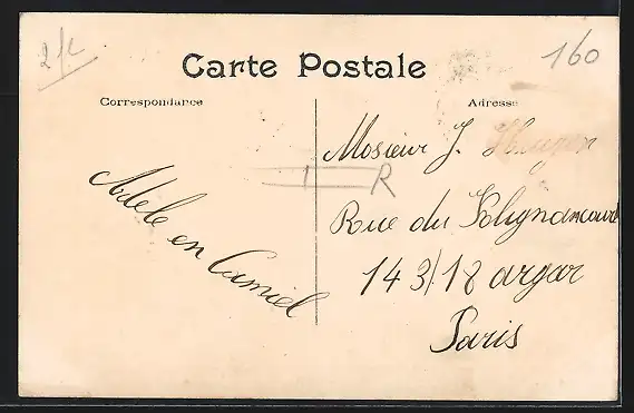 Personenbezogene Daten auf der Rückseite der Karte wurden durch blauen Textmarker unkenntlich gemacht. Die blauen Stellen sind auf die Vorderseite durchgeweicht und wirken sich negativ auf das Postkartenfoto aus