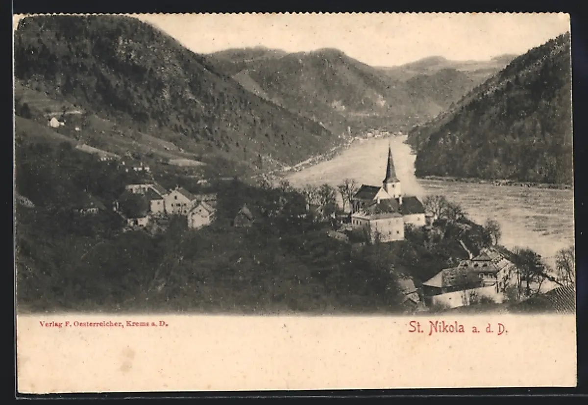 AK St. Nikola a. d. D., Flusspartie mit Kirche